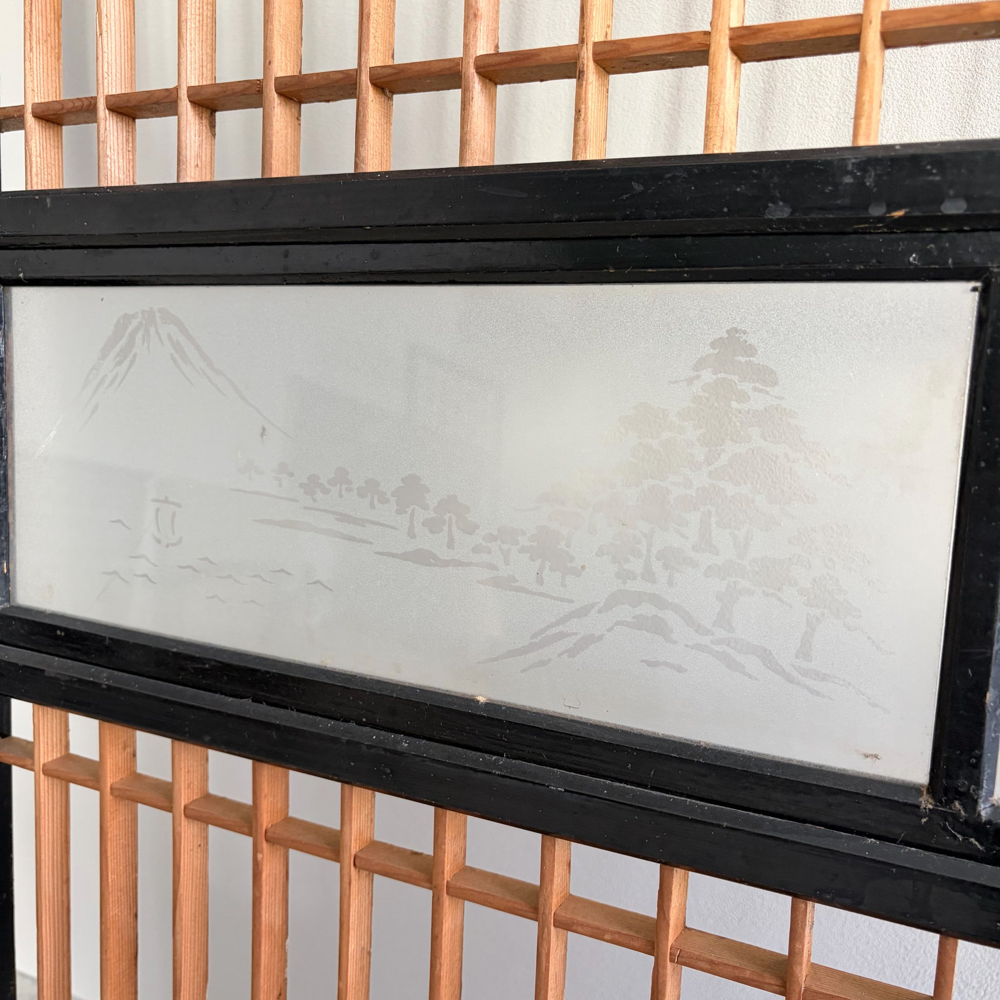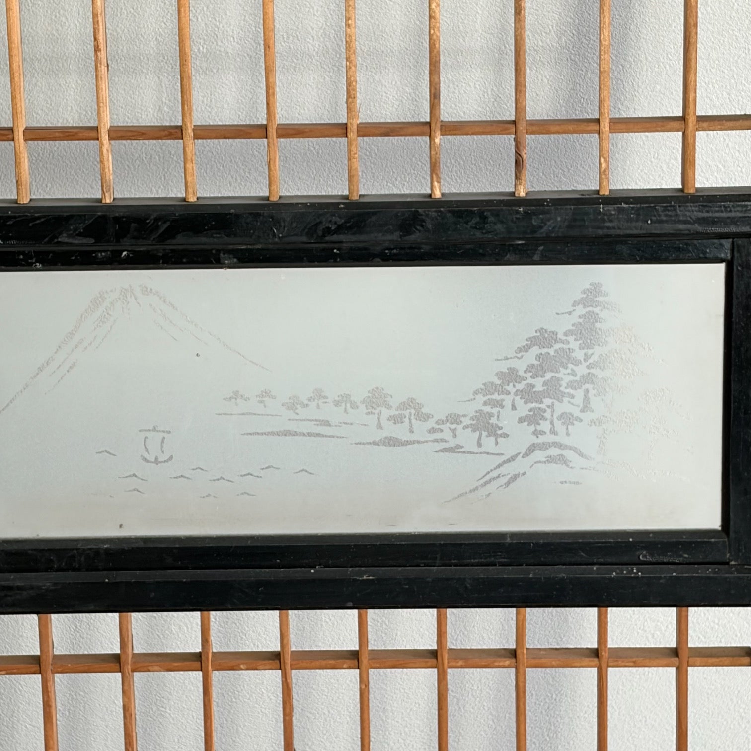 ガラス細工にはおそらく富士山でしょうか?大きな山と木々、小さな帆船が浮かぶ日本情緒あふれるデザインです。