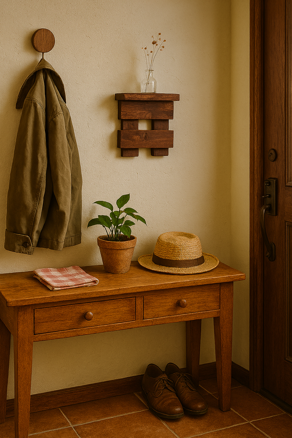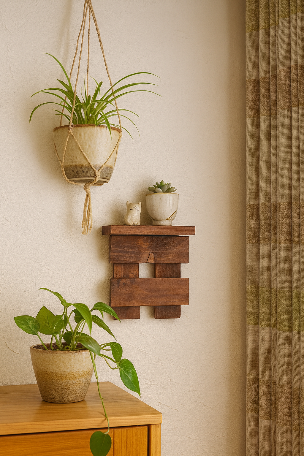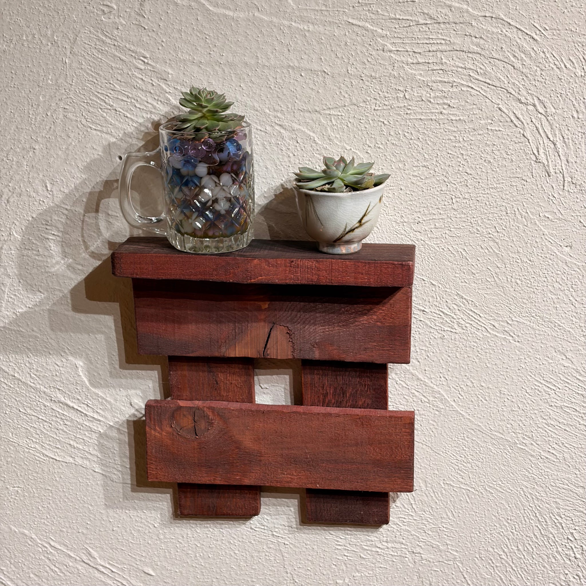 温かみを感じるブビンガの壁掛けディスプレイ台。